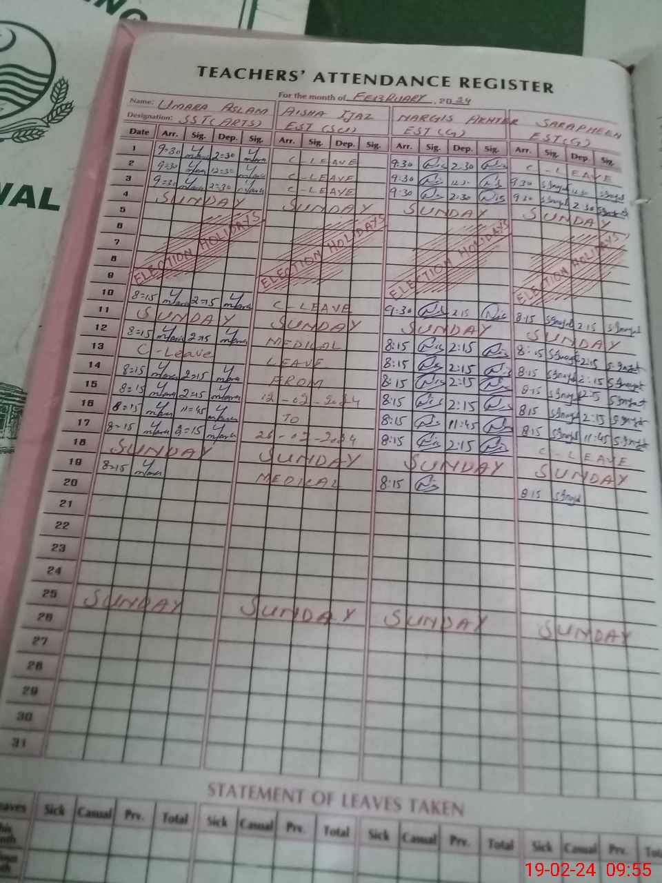 | 36**** | Sa**** Na**** | 3 | 1 | 0 | 0 | 0 | 0 | 0 | 0 | 0 | 0 | 0 | Exam Duty |