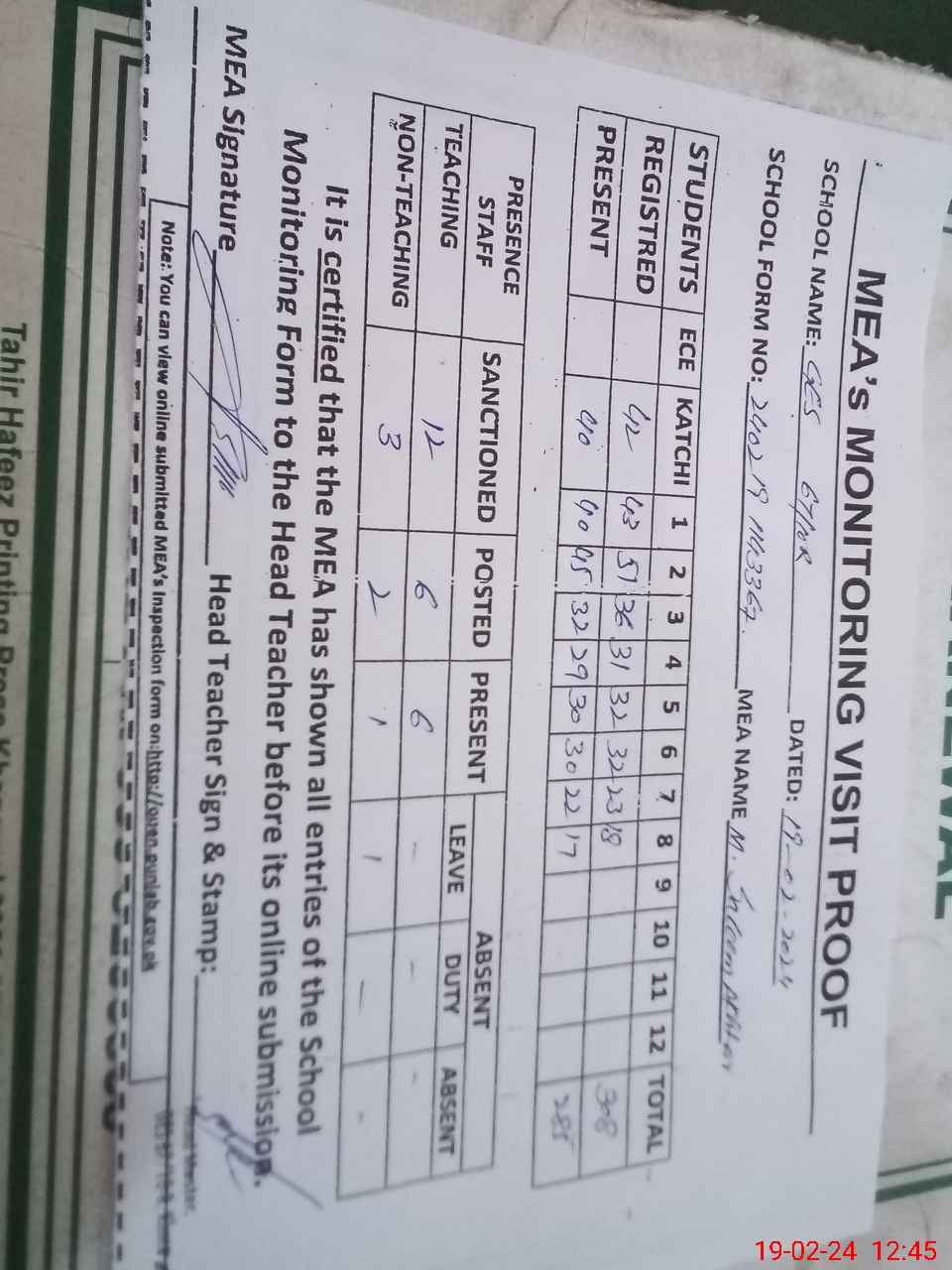 | Certified that this School was Inspected by the Undersigned MEA/DMO Today and the Information Stated Above is as Per Record. | |||||