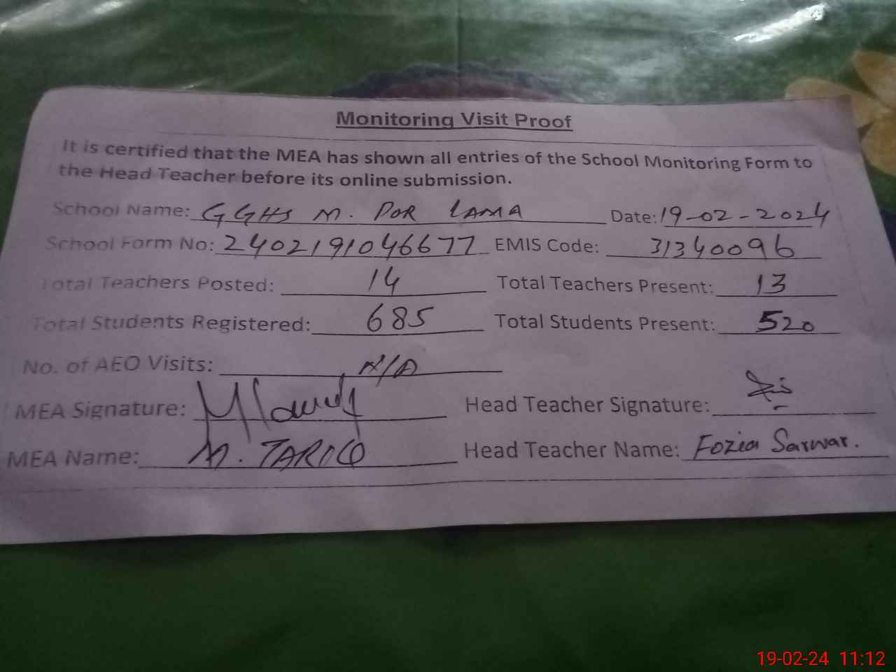 | EMIS Code: 31340096 | Name of School: GGHS MUHAMMAD PUR LAMMA | |||