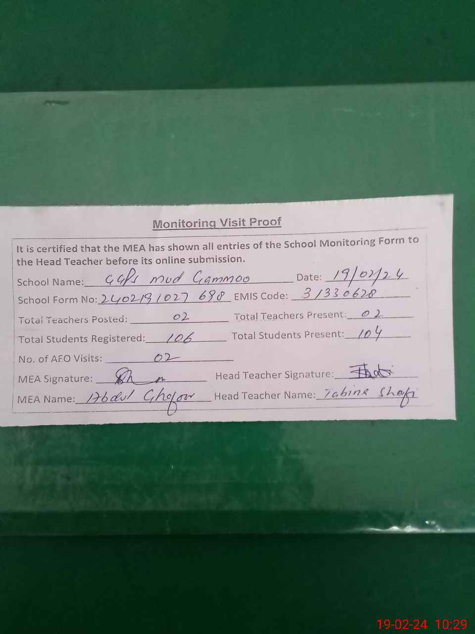 | Attendance Register | Head Teacher | MEA with School | Visit Proof |