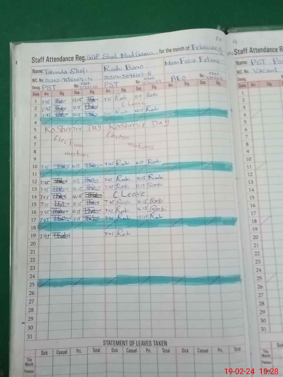| CNIC | Full Name | Designation | R/C | Absence During Last Calender Month |