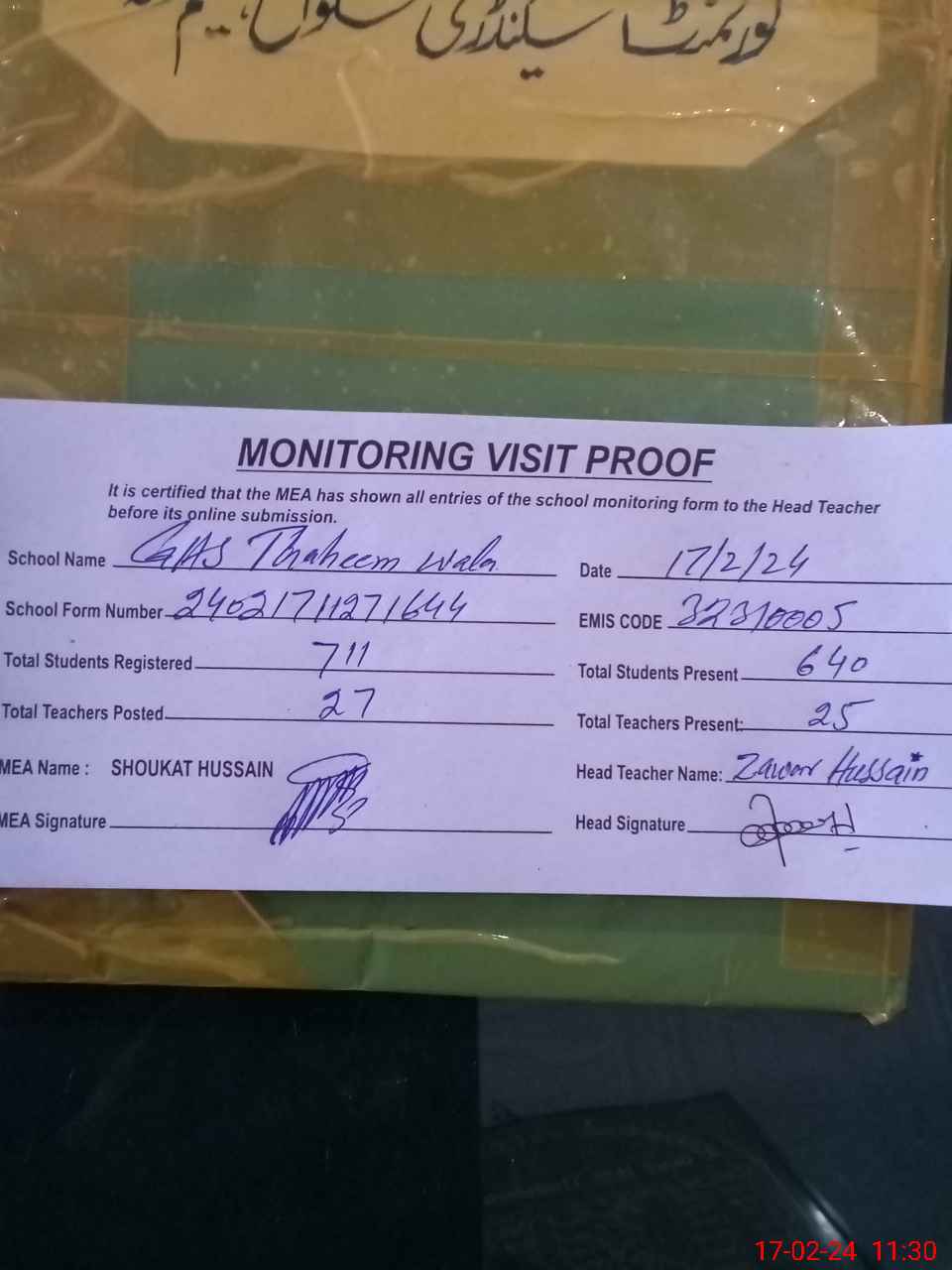 | Attendance Register | Head Teacher | MEA with School | Visit Proof |