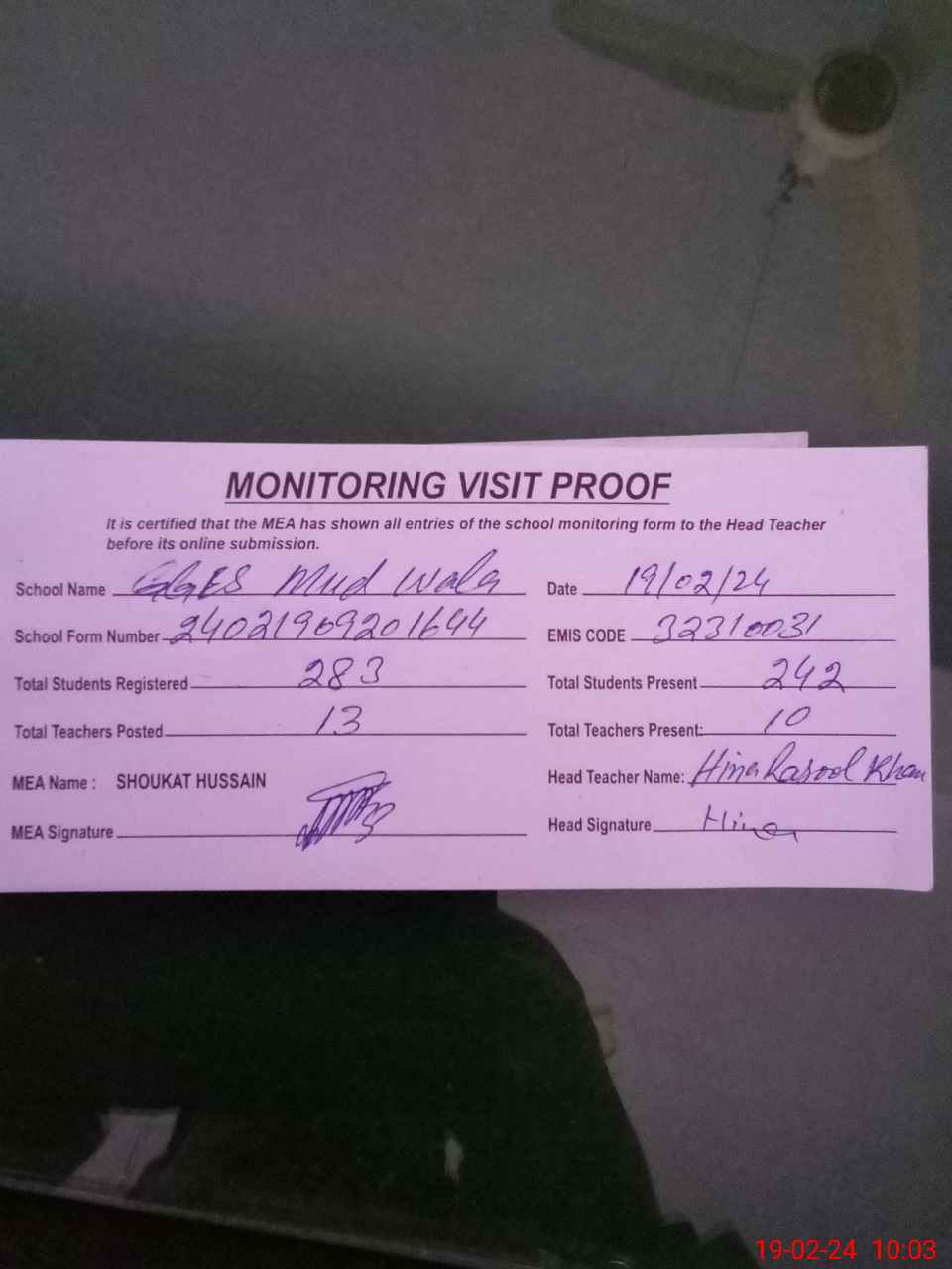 | Attendance Register | Head Teacher | MEA with School | Visit Proof |