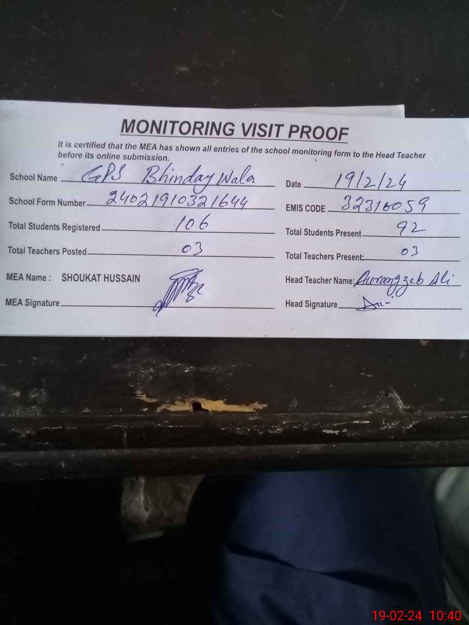 | EMIS Code: 32310059 | Name of School: GPS BHINDAY WALI | |||