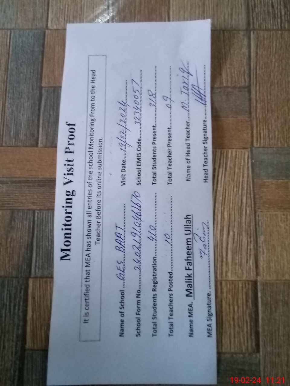 | Attendance Register | Head Teacher | MEA with School | Visit Proof |
