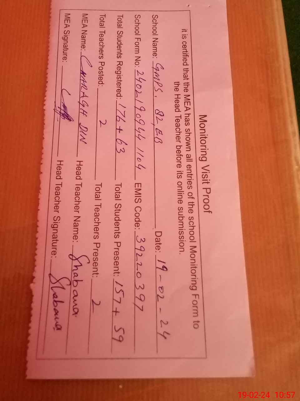| Attendance Register | Head Teacher | MEA with School | Visit Proof |