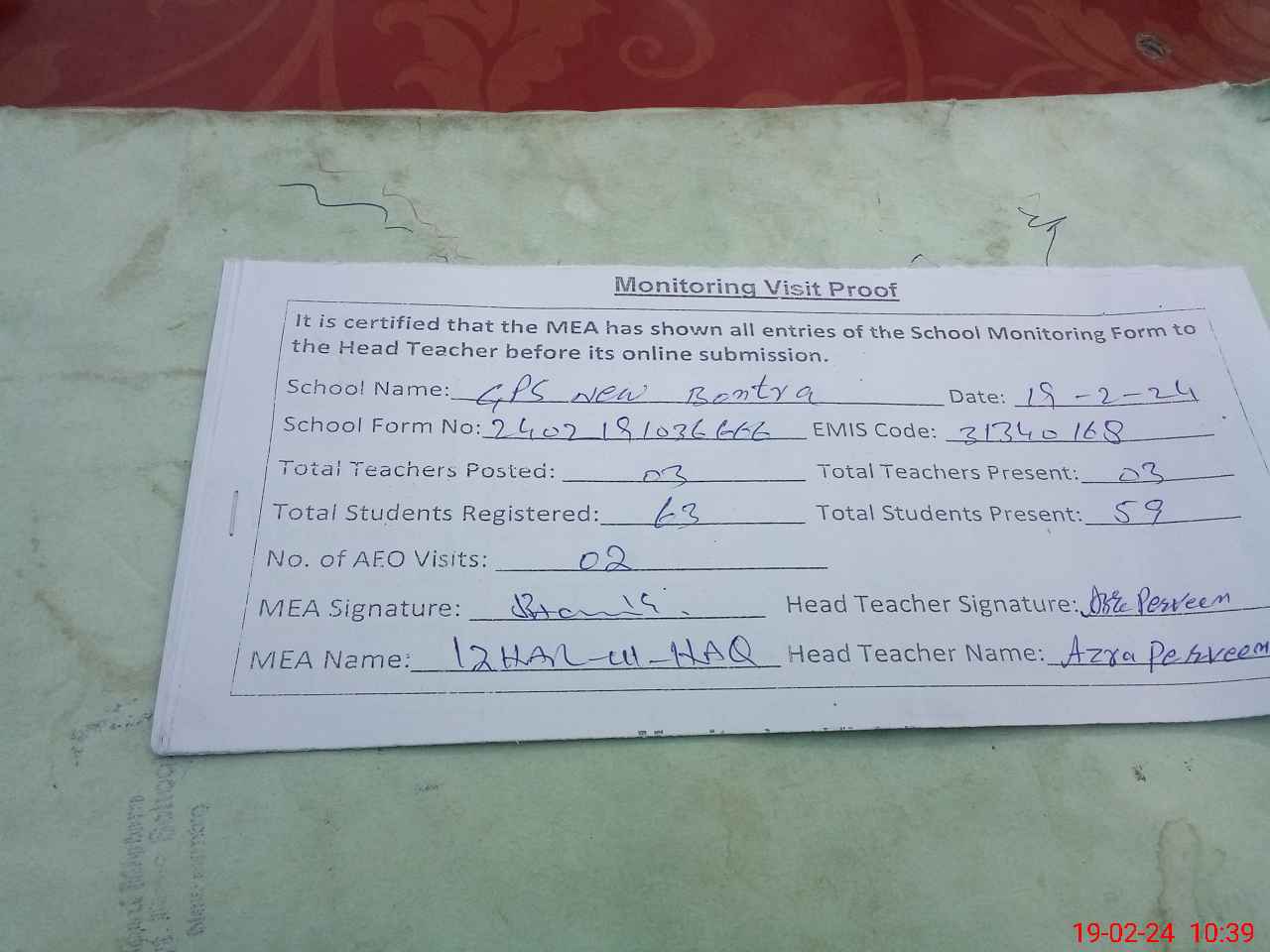 | Attendance Register | Head Teacher | MEA with School | Visit Proof |