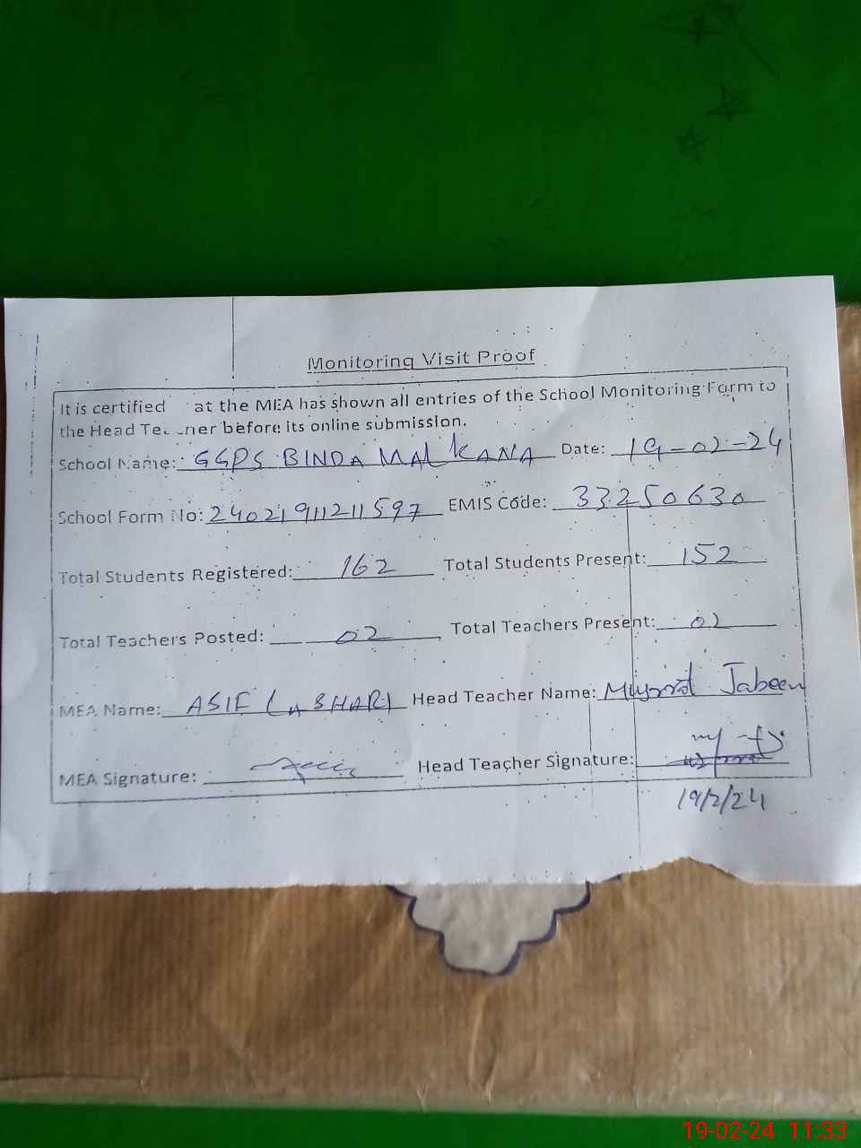 | Certified that this School was Inspected by the Undersigned MEA/DMO Today and the Information Stated Above is as Per Record. | |||||