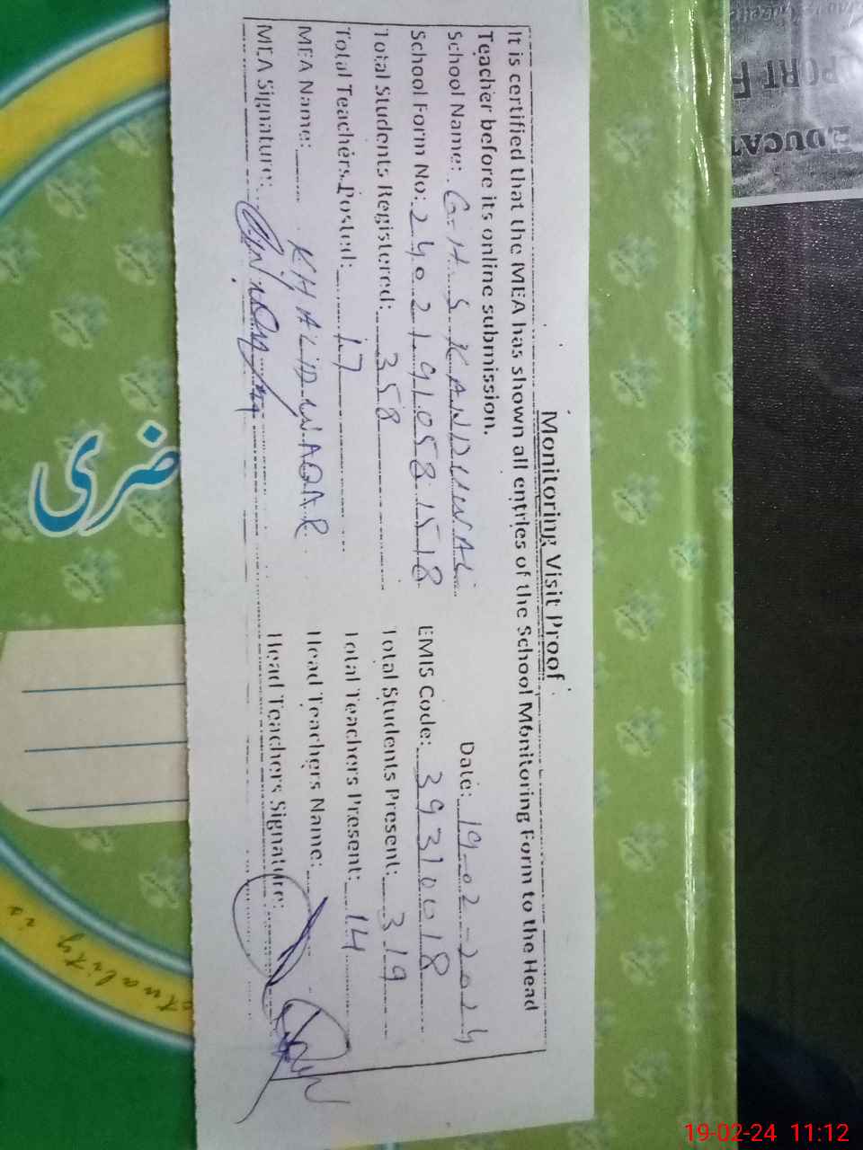 | Attendance Register | Head Teacher | MEA with School | Visit Proof |