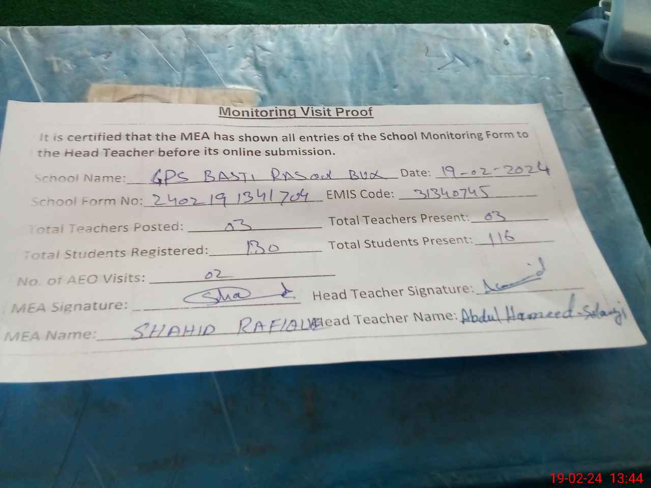 | Attendance Register | Head Teacher | MEA with School | Visit Proof |