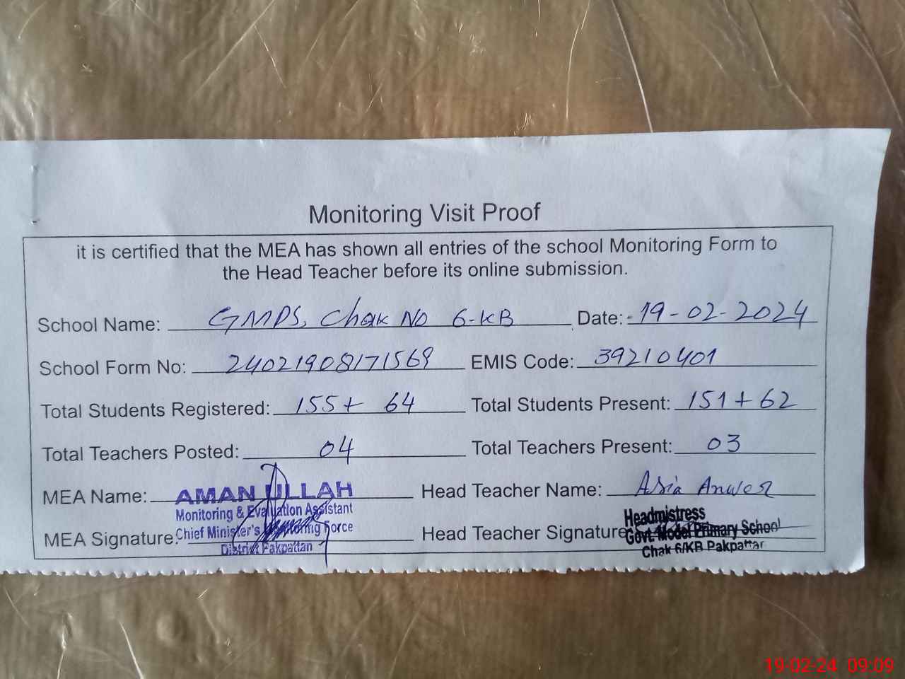 | Attendance Register | Head Teacher | MEA with School | Visit Proof |