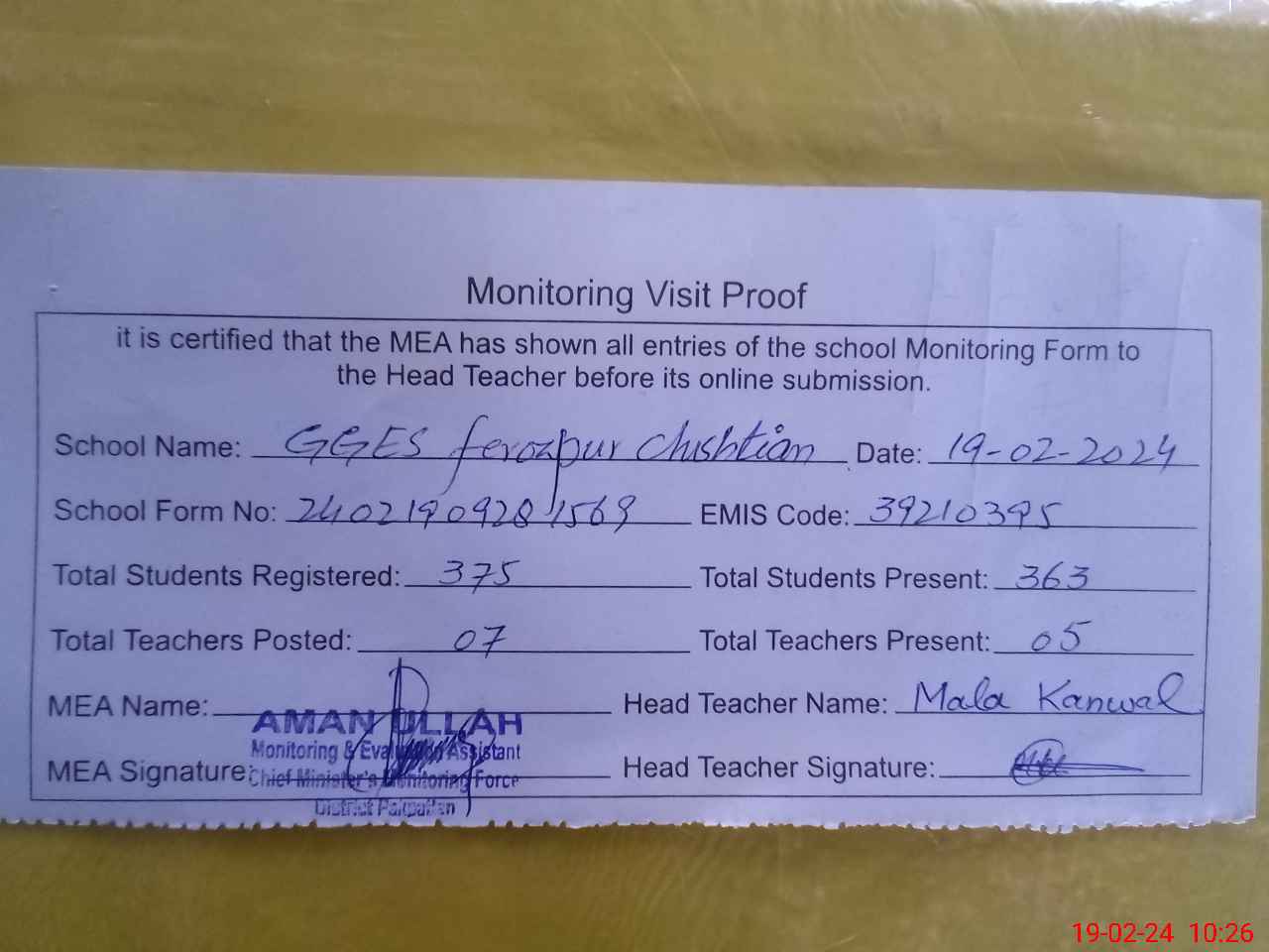 | Attendance Register | Head Teacher | MEA with School | Visit Proof |