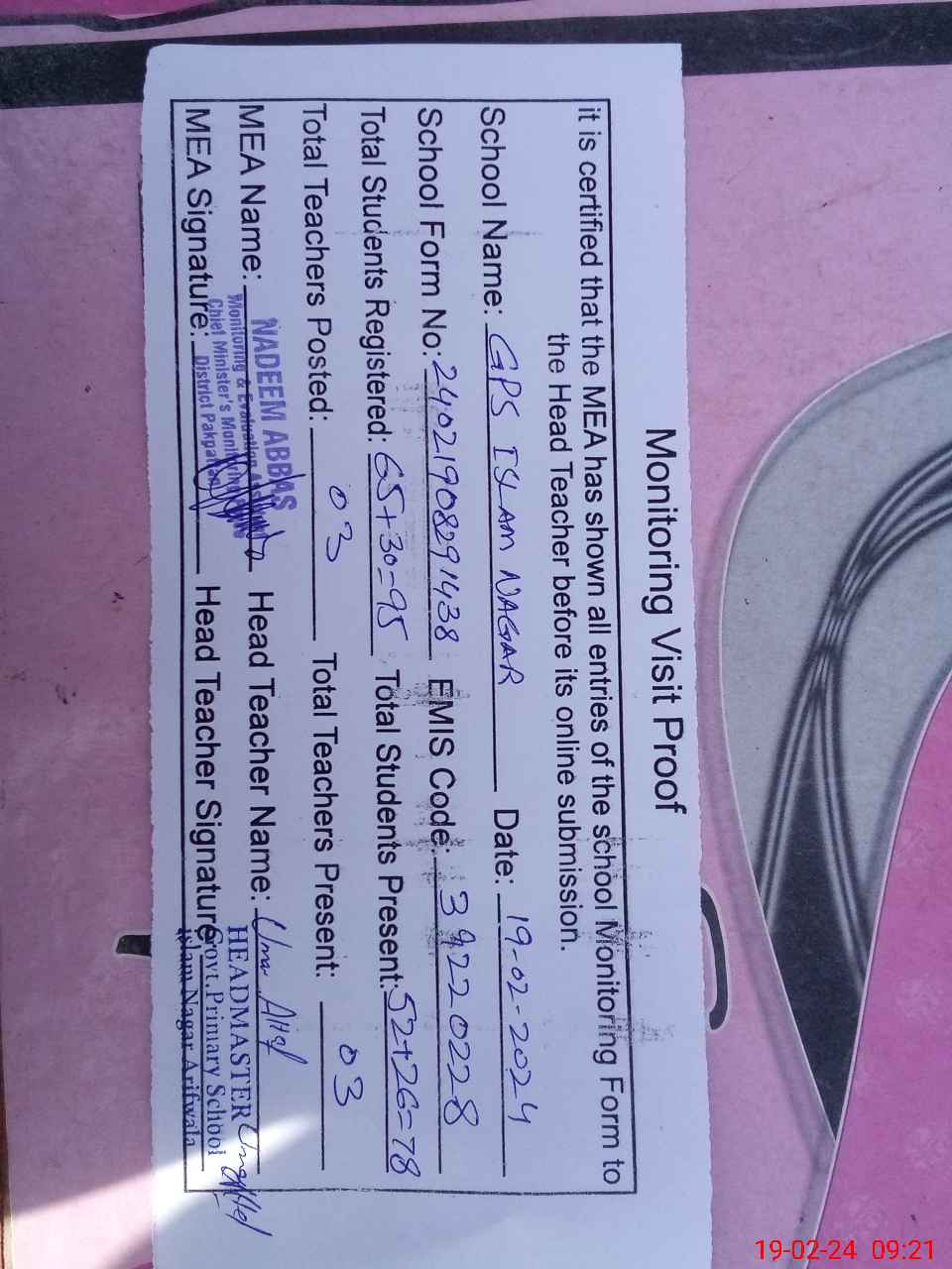 | EMIS Code: 39220228 | Name of School: GPS ISLAM NAGAR P.O 131 EB | |||
