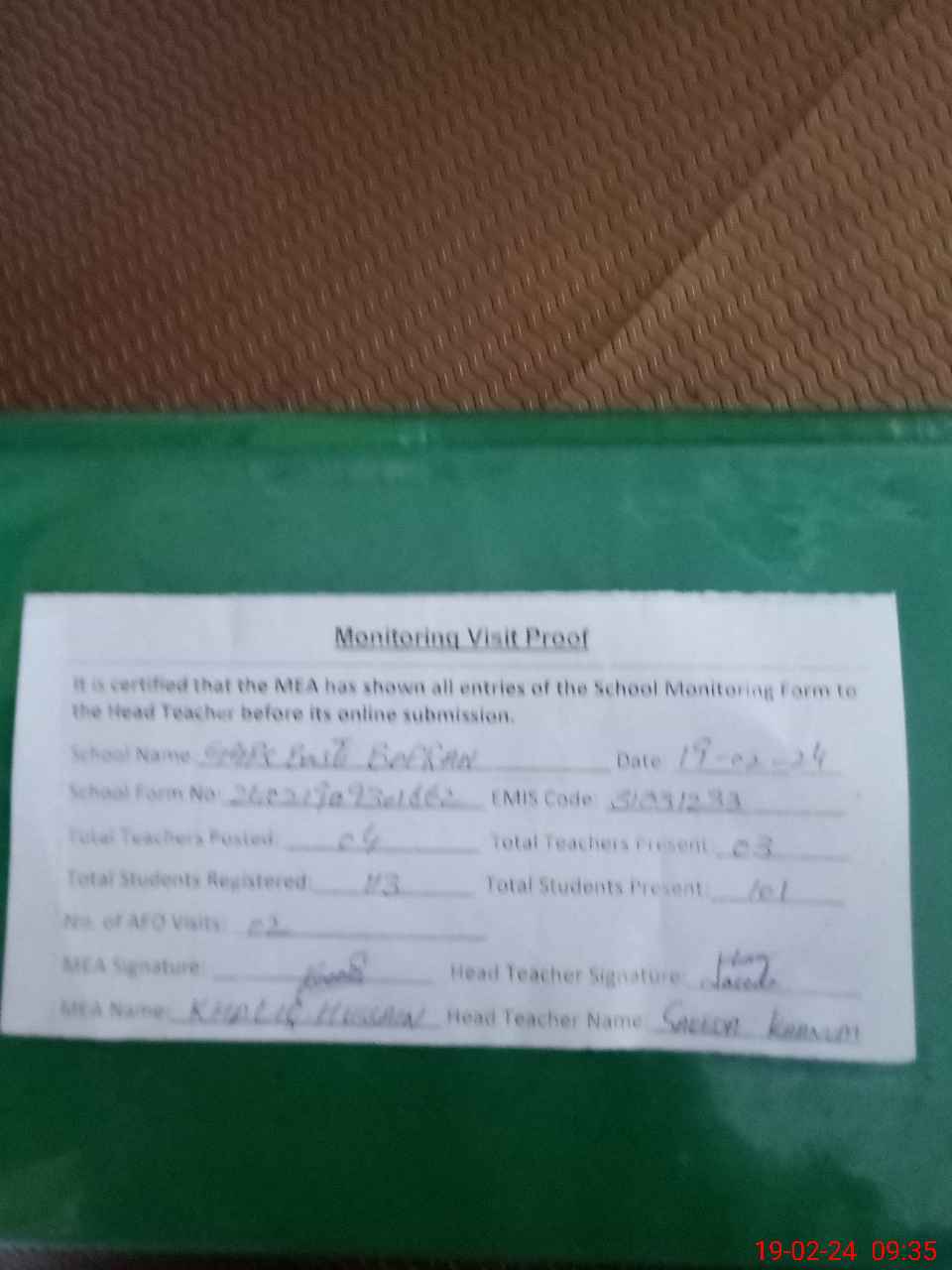 | Attendance Register | Head Teacher | MEA with School | Visit Proof |