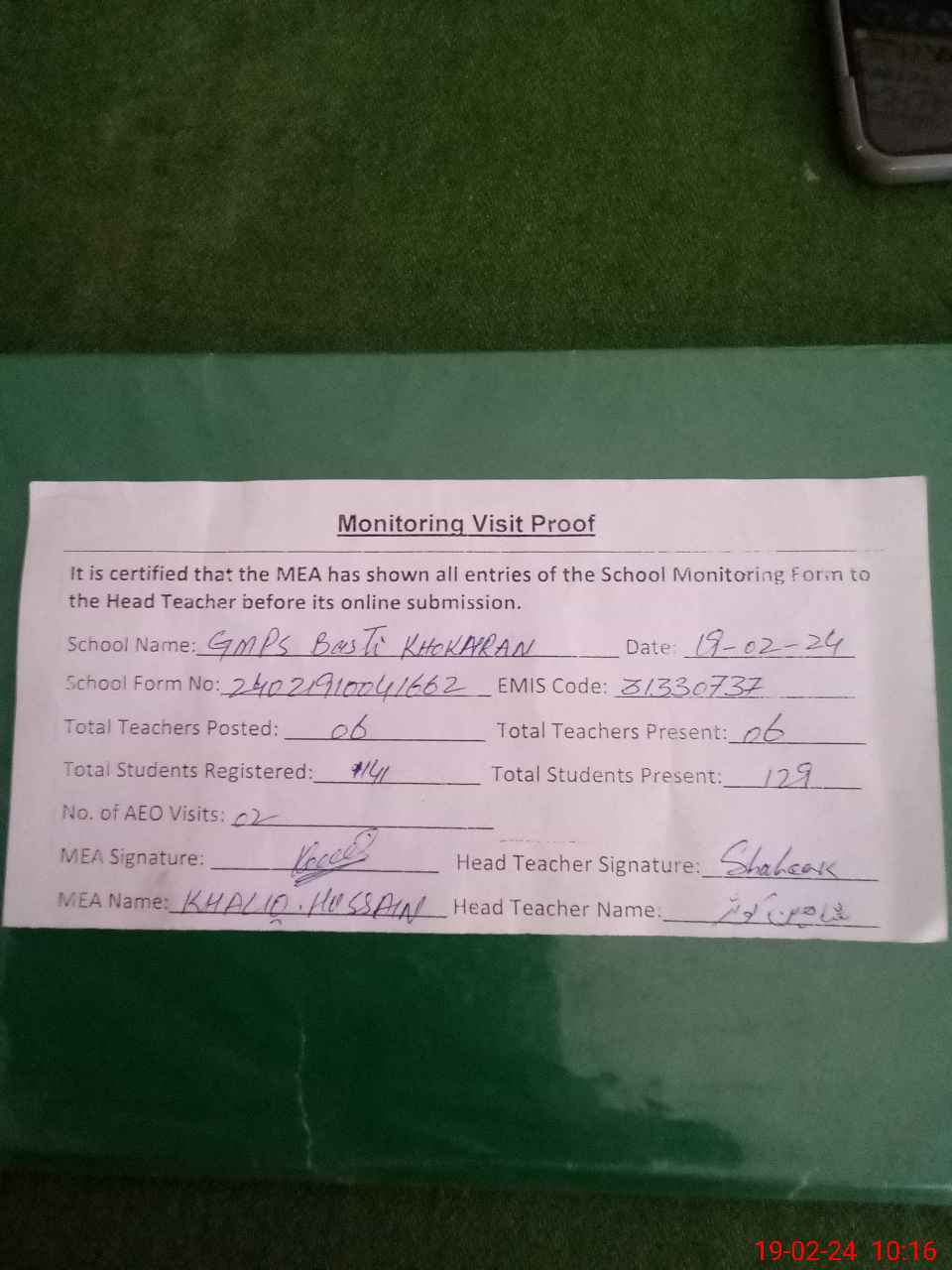 | Attendance Register | Head Teacher | MEA with School | Visit Proof |