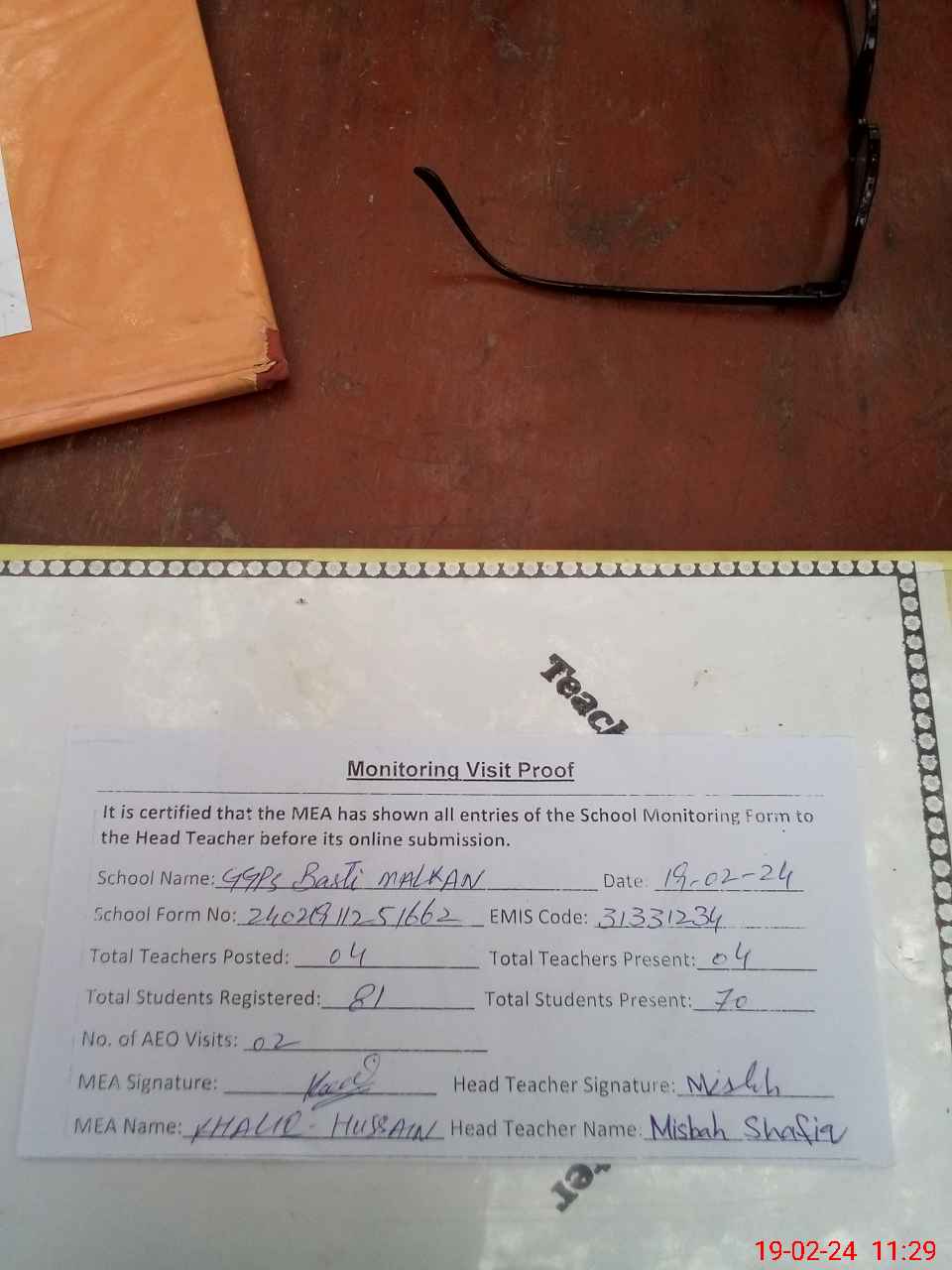 | Attendance Register | Head Teacher | MEA with School | Visit Proof |