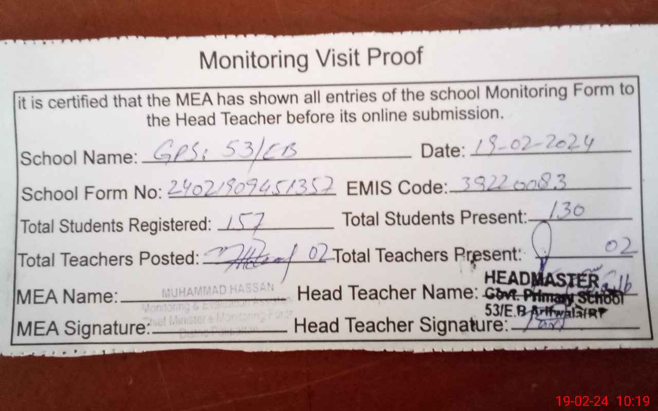| EMIS Code: 39220083 | Name of School: GPS 53 EB P/O ARIF WALA | |||
