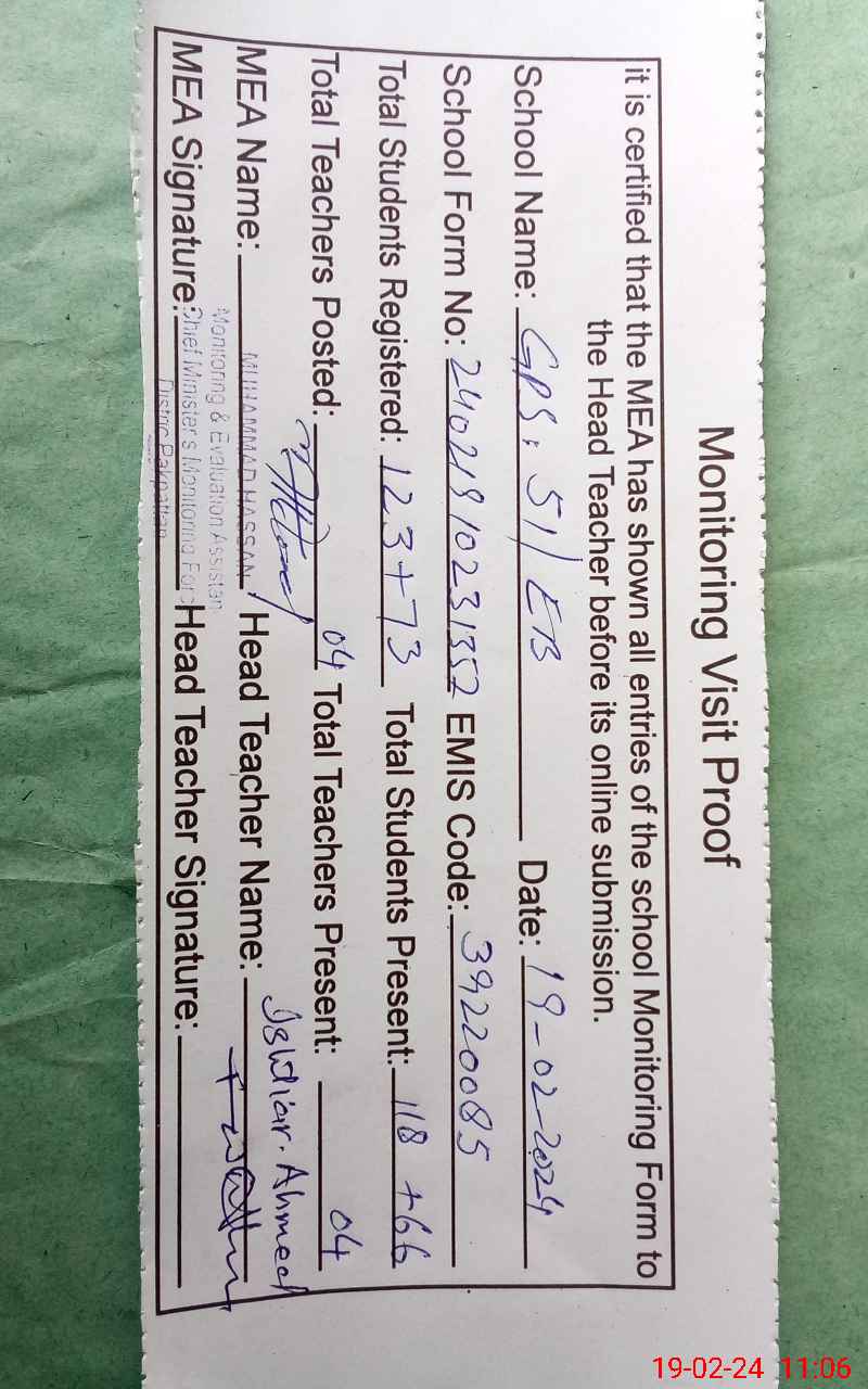 | Name: IS**** AH**** Designation: (School Headmaster's/Headmistress's) PST Phone/Cell Number: 03**** |