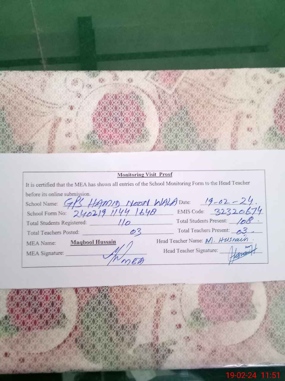 | EMIS Code: 32320674 | Name of School: GPS HAMID NOON WALA | |||