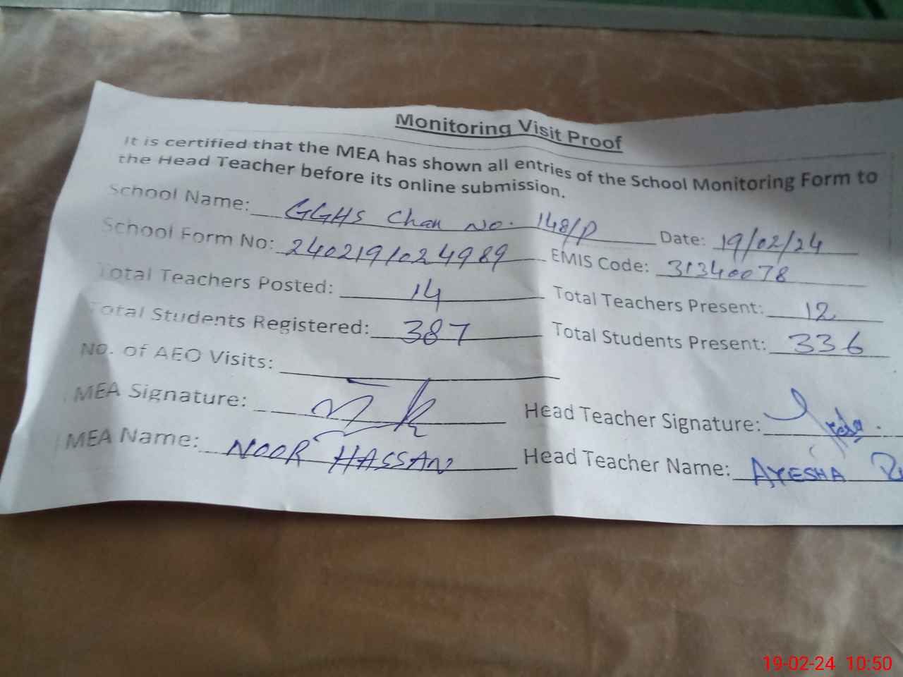 | Attendance Register | Head Teacher | MEA with School | Visit Proof |
