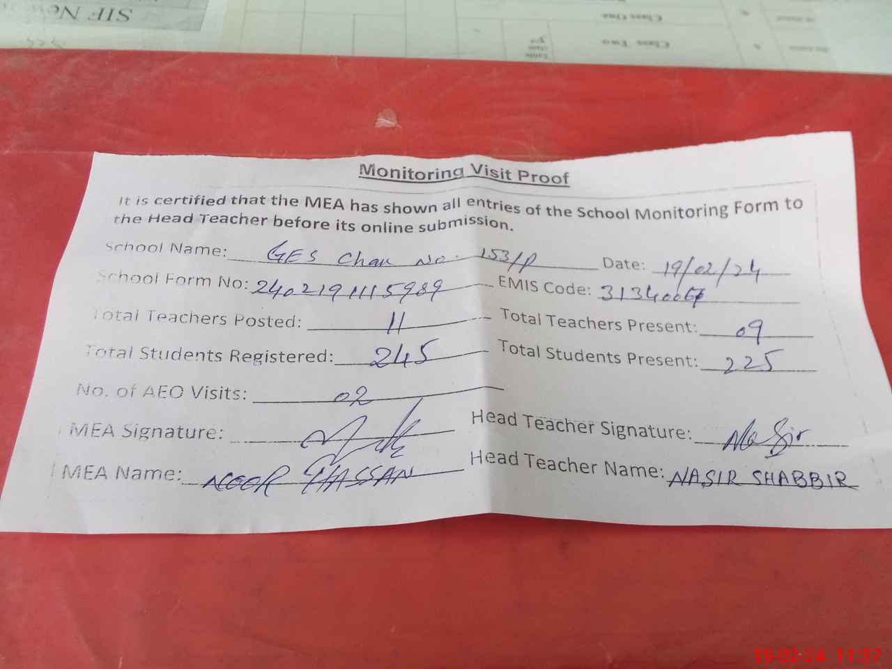 | Attendance Register | Head Teacher | MEA with School | Visit Proof |