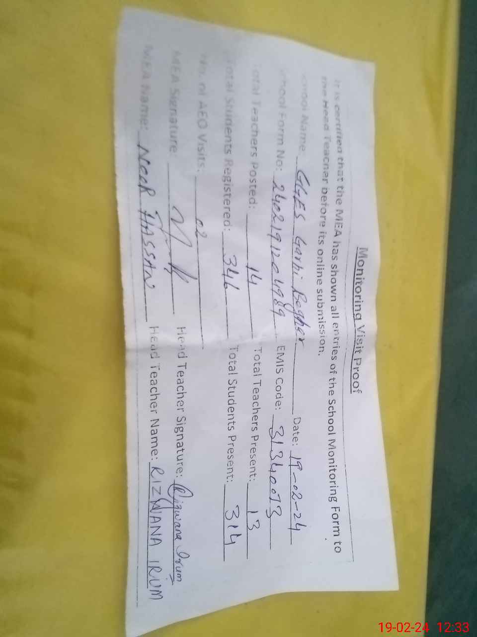 | Attendance Register | Head Teacher | MEA with School | Visit Proof |