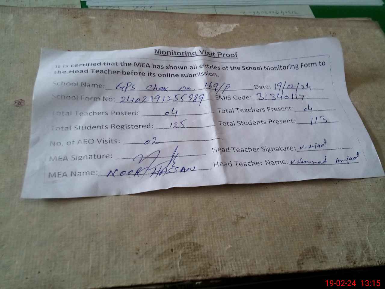 | EMIS Code: 31340117 | Name of School: GPS CHAK NO 169/P | |||