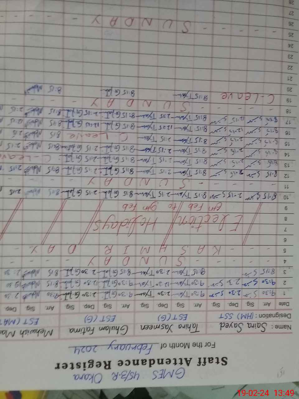 | CNIC | Full Name | Designation | R/C | Absence During Last Calender Month |