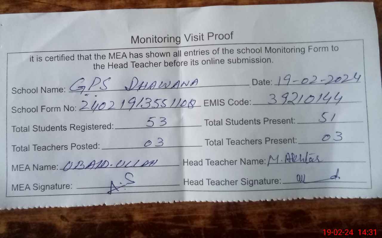 | EMIS Code: 39210144 | Name of School: GPS DHAWANA | |||