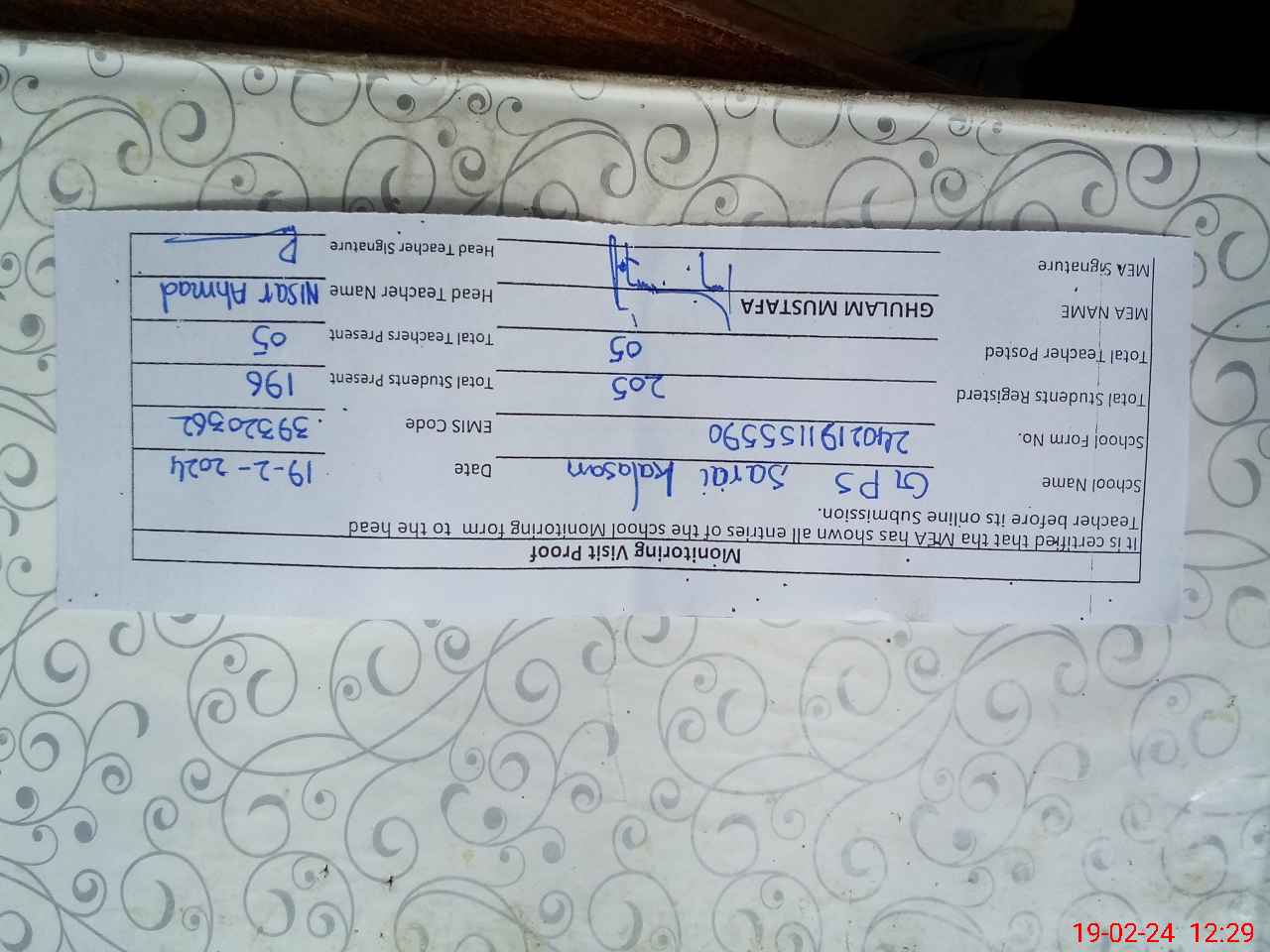 | Certified that this School was Inspected by the Undersigned MEA/DMO Today and the Information Stated Above is as Per Record. | |||||
