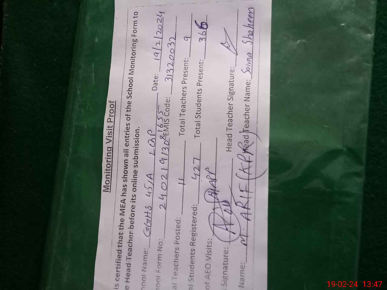 | Attendance Register | Head Teacher | MEA with School | Visit Proof |