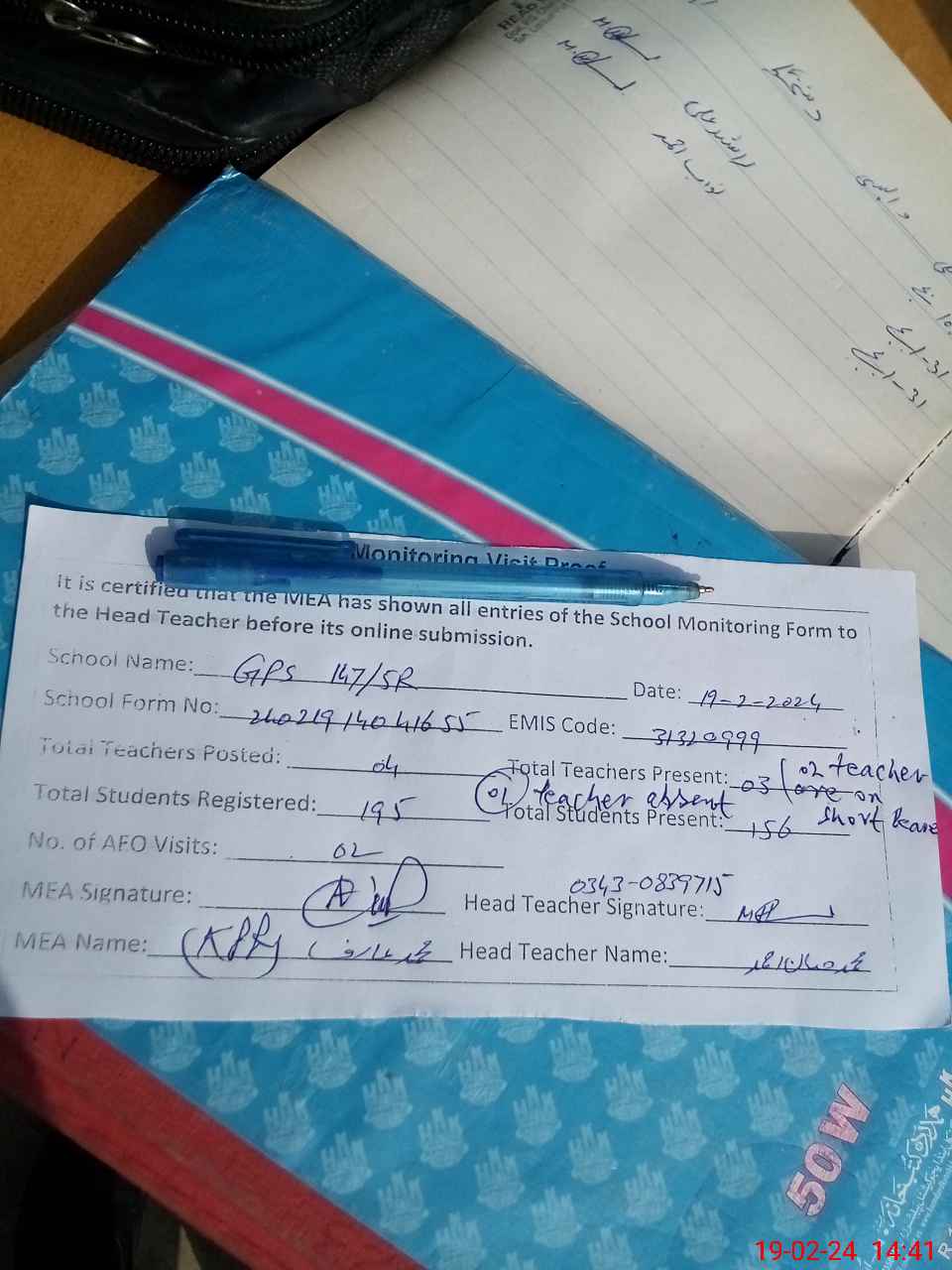 | Attendance Register | Head Teacher | MEA with School | Visit Proof |