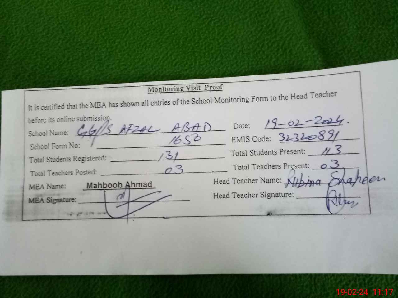 | Attendance Register | Head Teacher | MEA with School | Visit Proof |