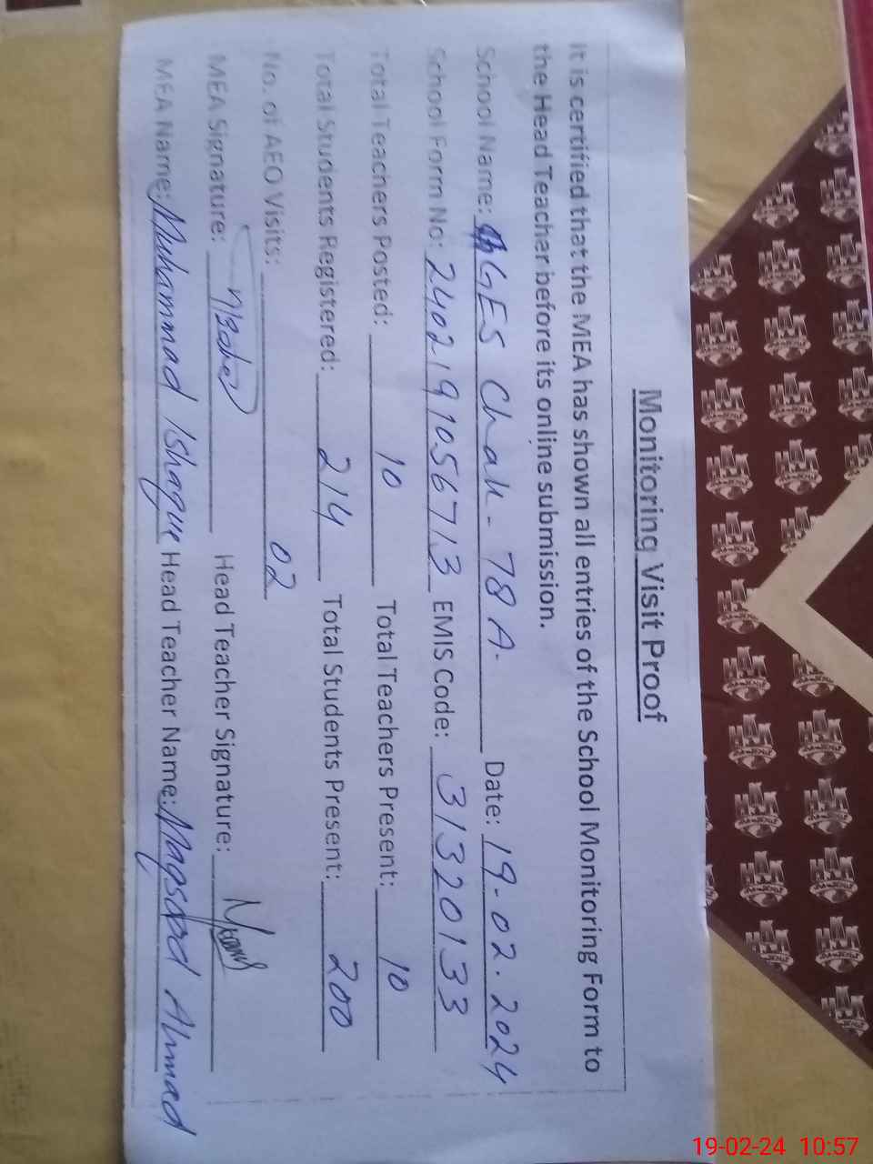 | Attendance Register | Head Teacher | MEA with School | Visit Proof |