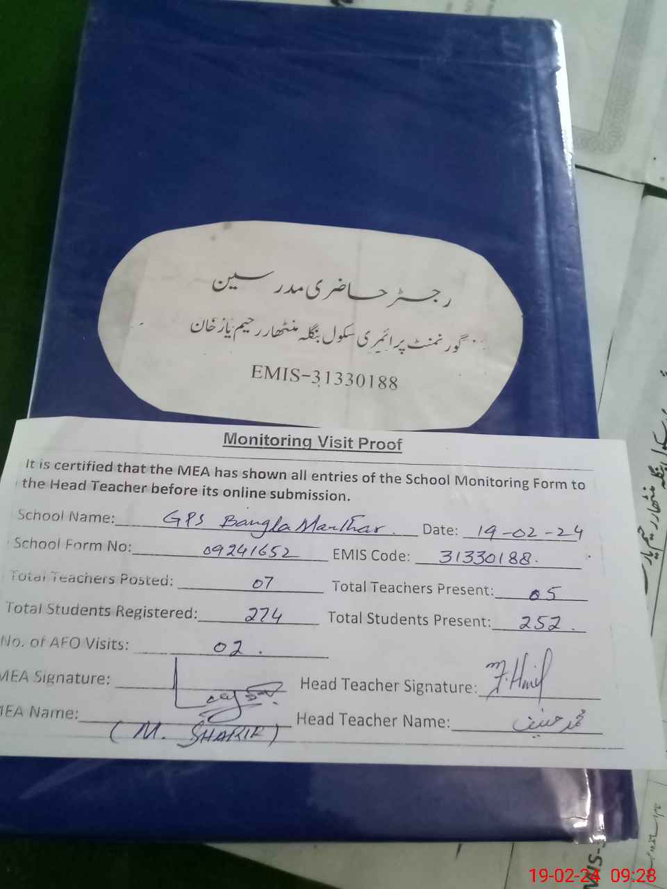 | Attendance Register | Head Teacher | MEA with School | Visit Proof |