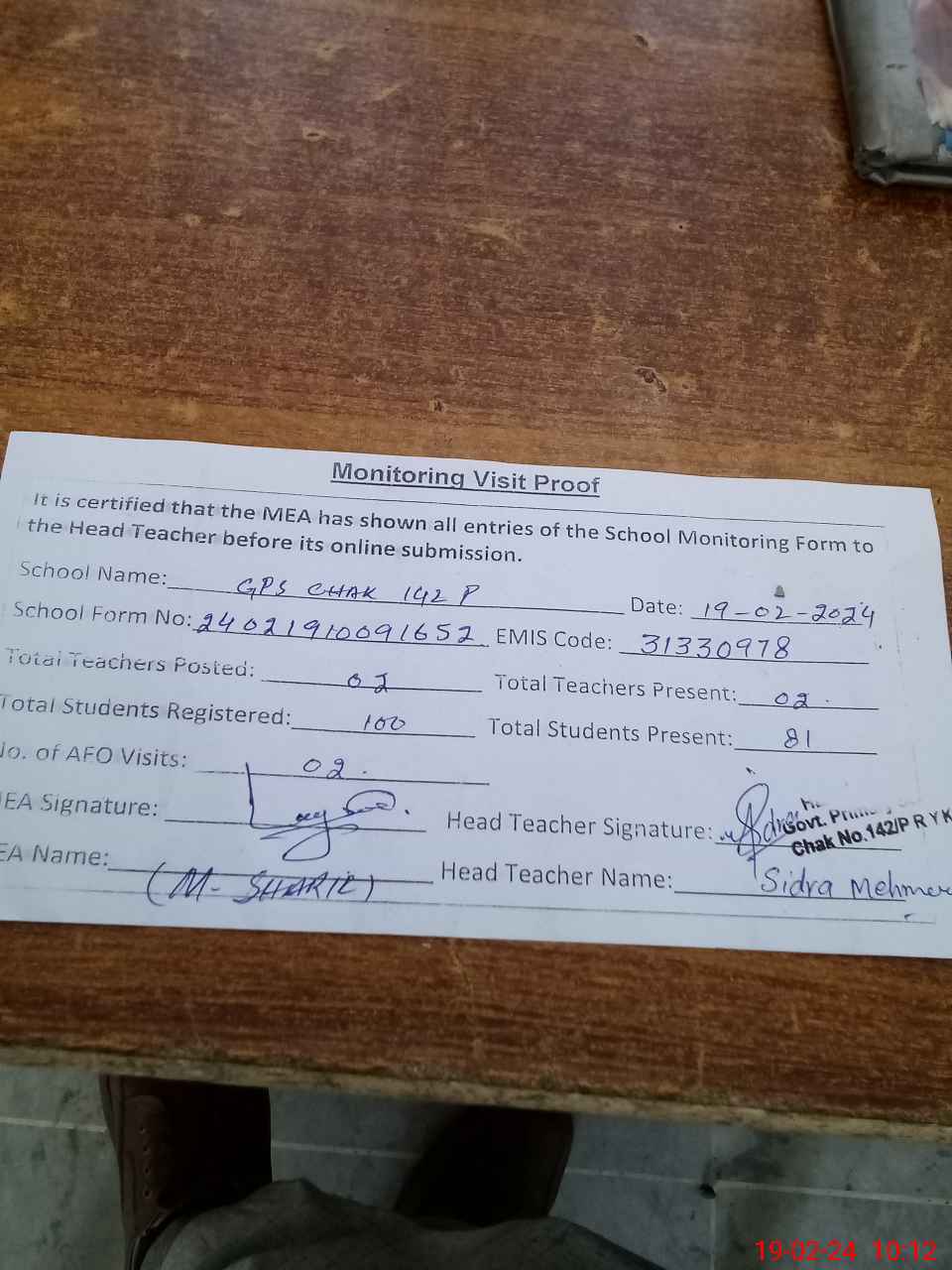 | Attendance Register | Head Teacher | MEA with School | Visit Proof |