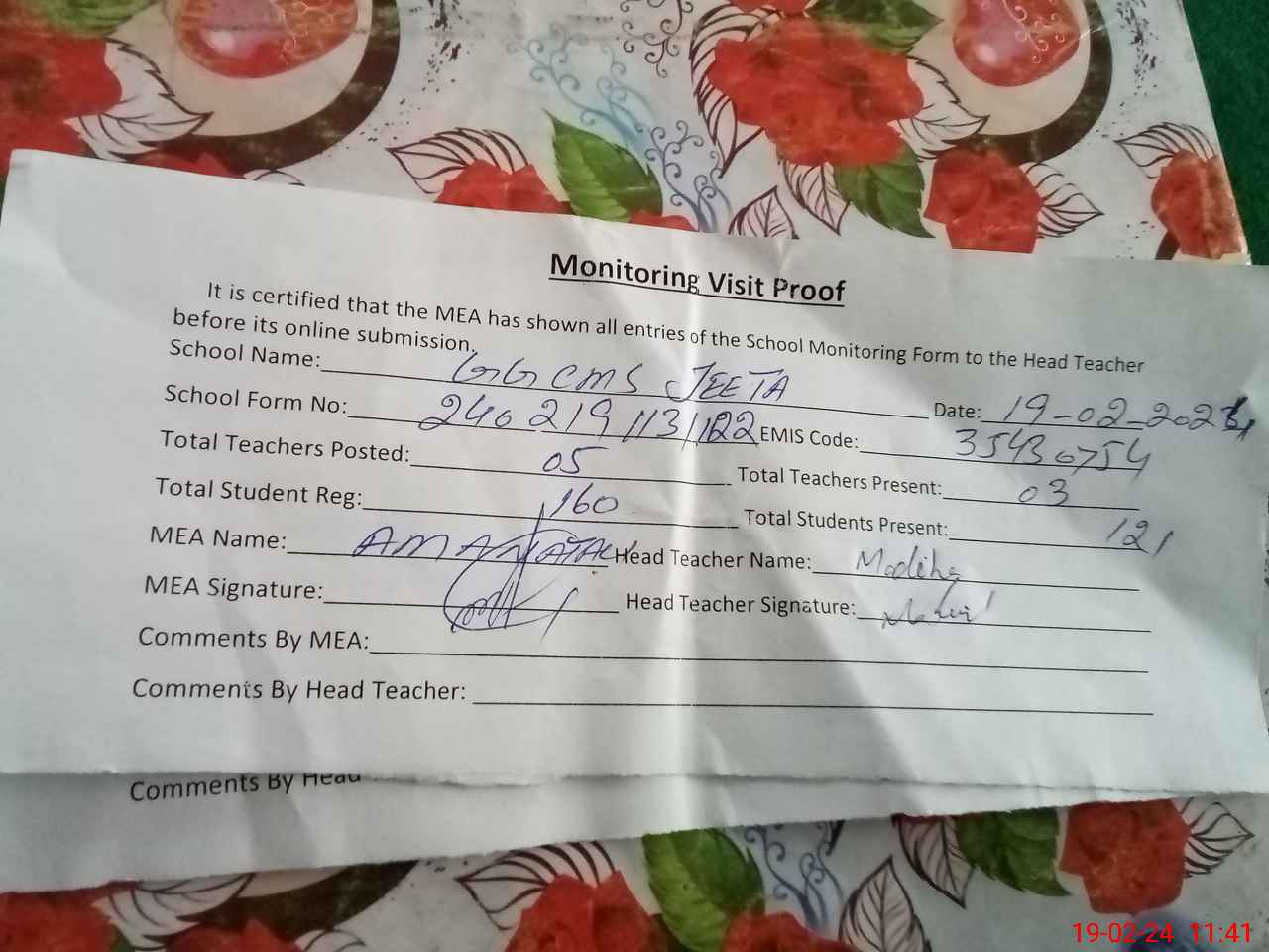 | Attendance Register | Head Teacher | MEA with School | Visit Proof |