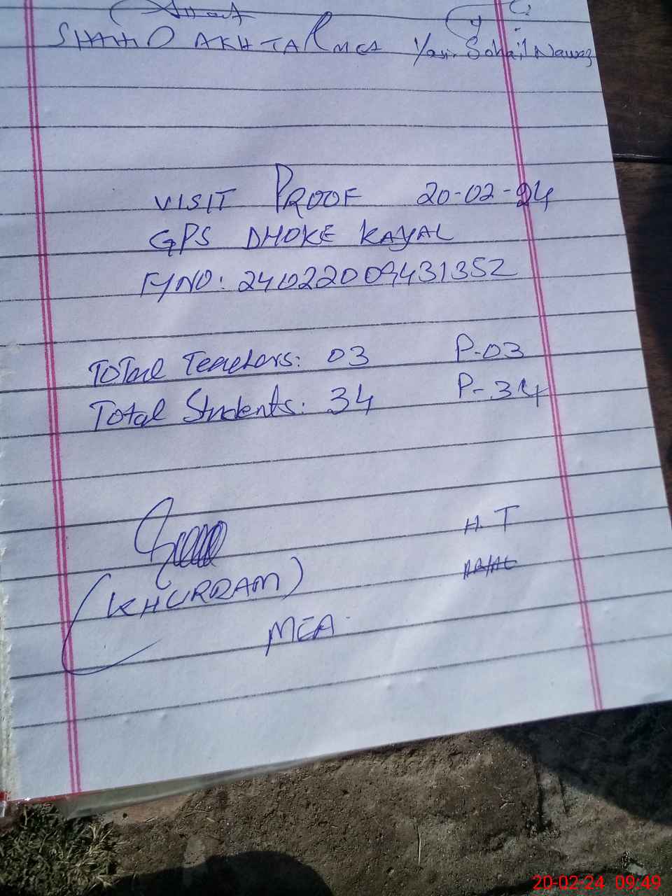 | Attendance Register | Head Teacher | MEA with School | Visit Proof |