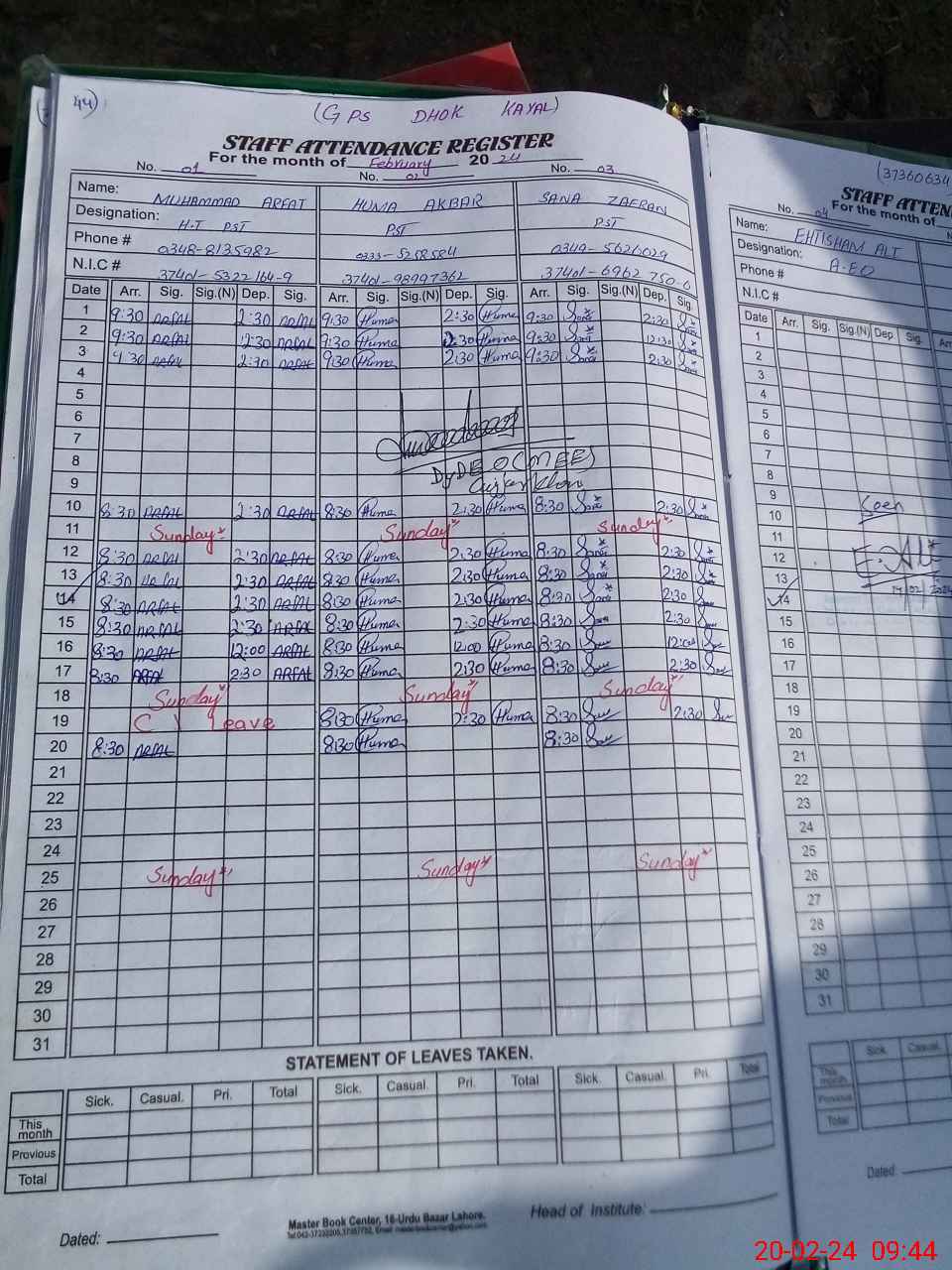 | CNIC | Full Name | Designation | R/C | Absence During Last Calender Month |