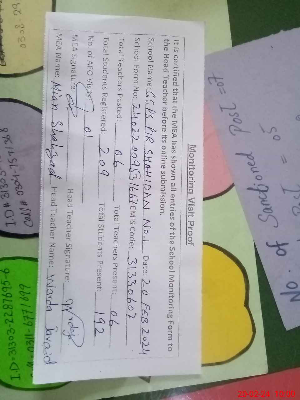 | Attendance Register | Head Teacher | MEA with School | Visit Proof |