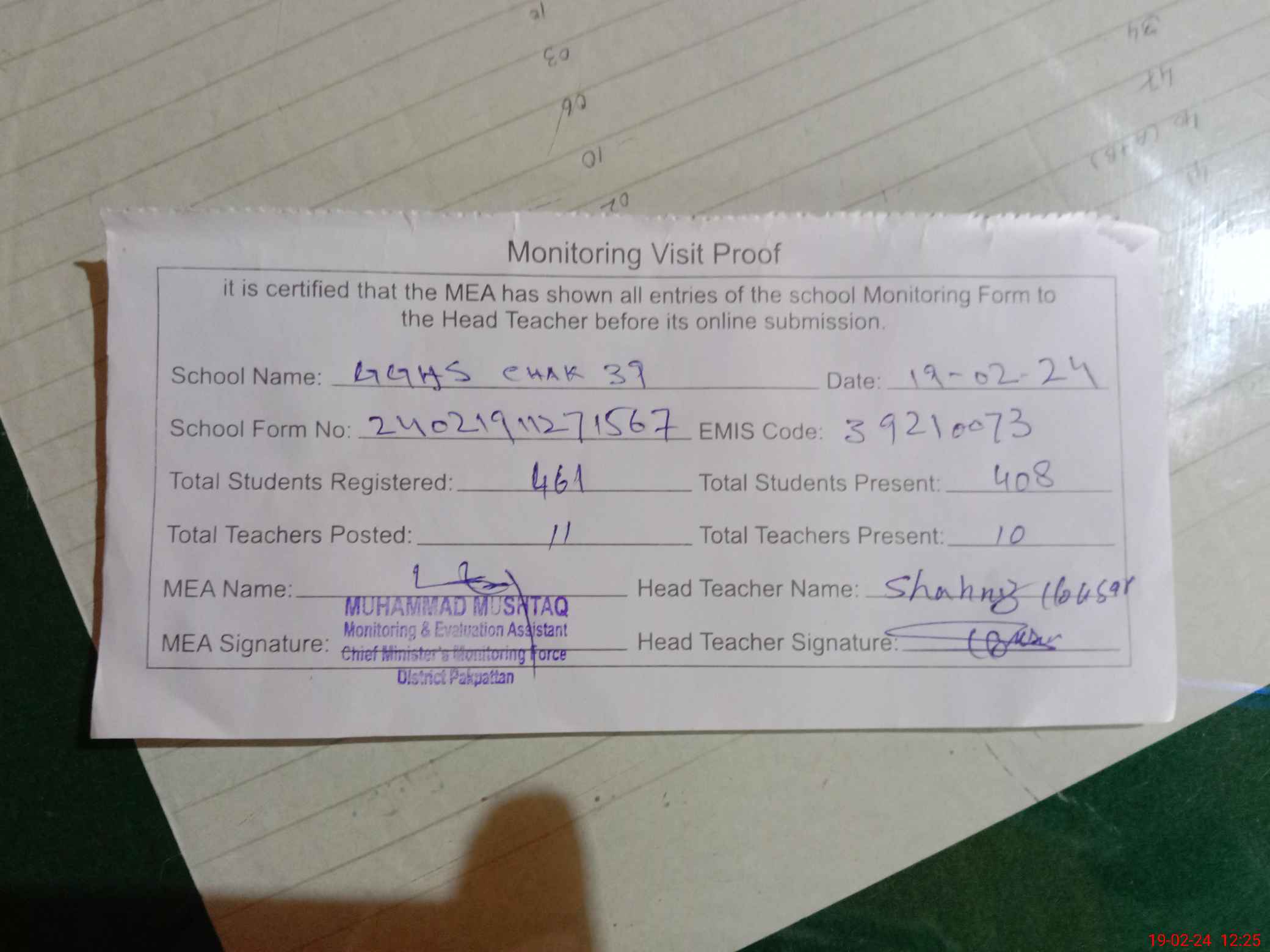 | Certified that this School was Inspected by the Undersigned MEA/DMO Today and the Information Stated Above is as Per Record. | |||||