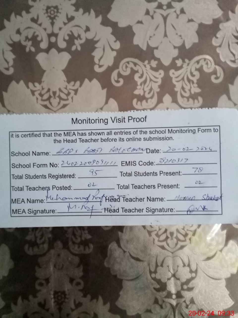 | Attendance Register | Head Teacher | MEA with School | Visit Proof |