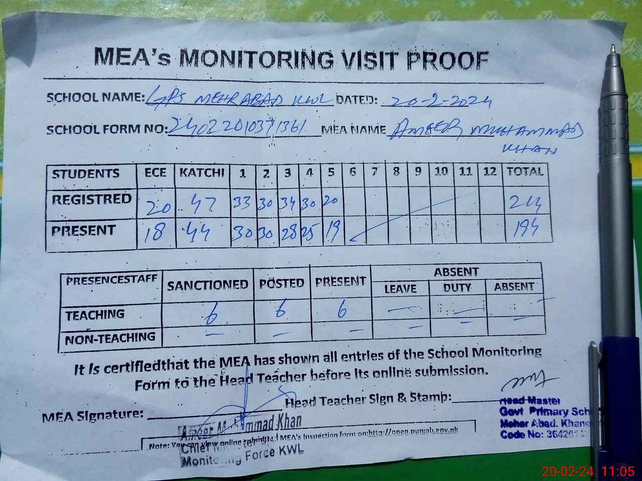 | Attendance Register | Head Teacher | MEA with School | Visit Proof |