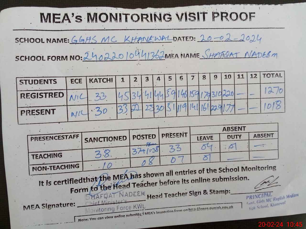 | EMIS Code: 36420042 | Name of School: GGHS MC KHANEWAL | |||
