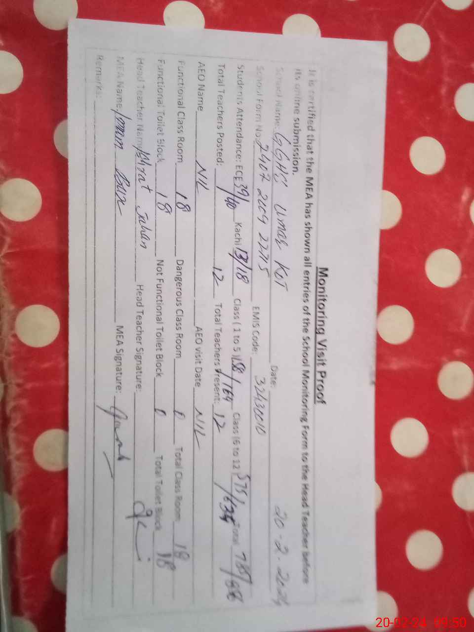 | Attendance Register | Head Teacher | MEA with School | Visit Proof |