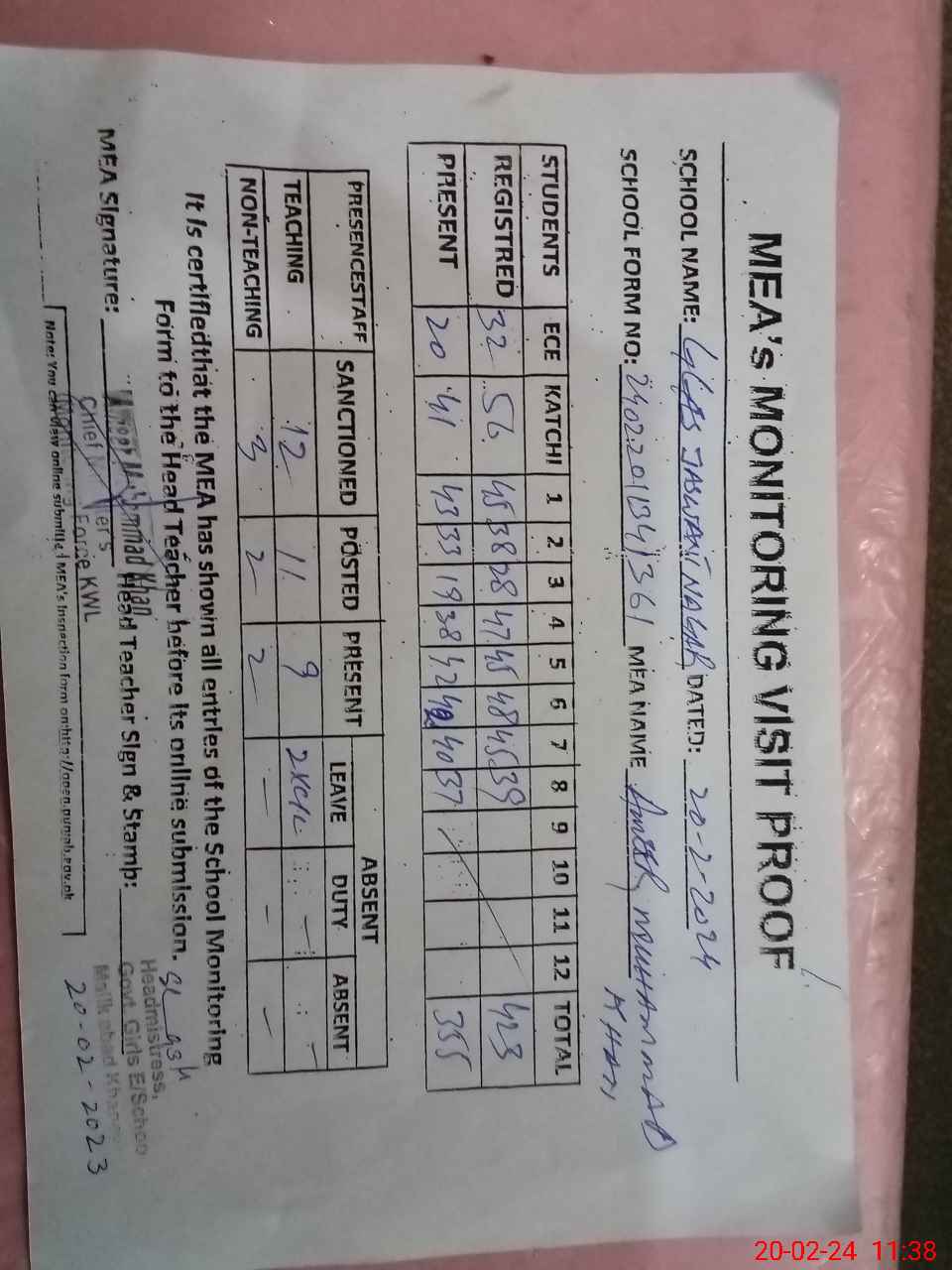| Attendance Register | Head Teacher | MEA with School | Visit Proof |