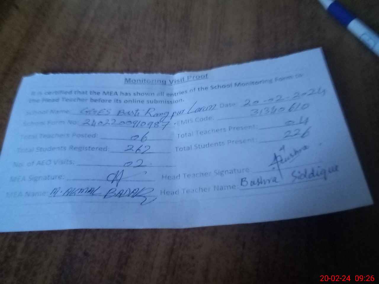 | EMIS Code: 31340610 | Name of School: GGES BASTI RANG PUR LARAN | |||