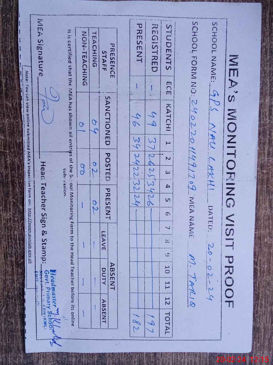 | Attendance Register | Head Teacher | MEA with School | Visit Proof |