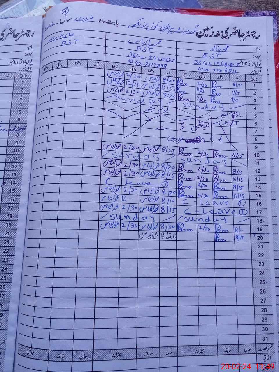 | CNIC | Full Name | Designation | R/C | Absence During Last Calender Month |