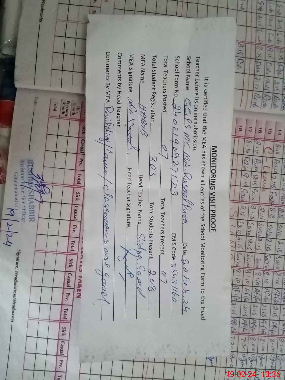 | Attendance Register | Head Teacher | MEA with School | Visit Proof |